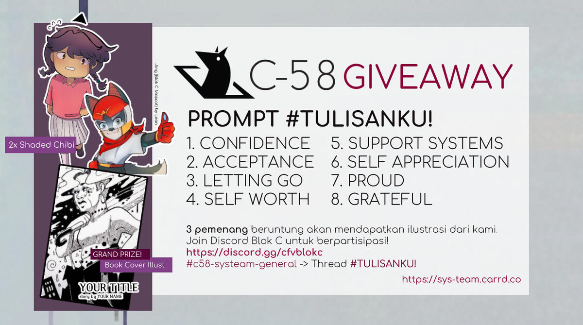 ★ Masuk ke discord Blok C (https://discord.gg/blokc) dan cari #C58-systeam-general. Di sana akan ada thread #TULISANKU!